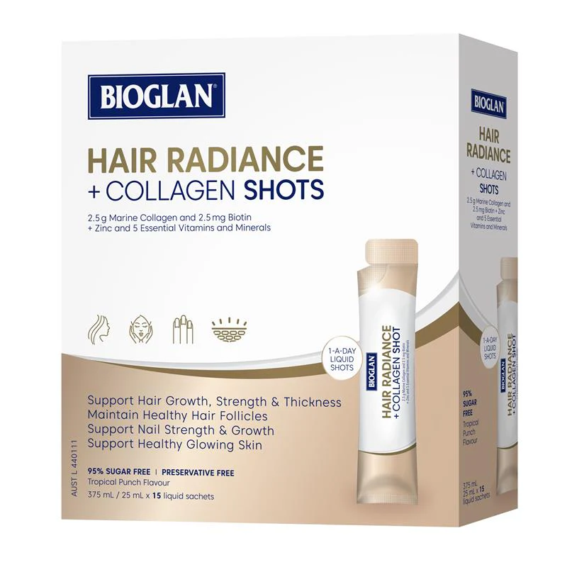 Bioglan Hair Radiance + Collagen Shots are a specially formulated premium blend of 7 active ingredients plus marine collagen to support hair growth, thickness and strength; firmer, glowing skin; plus nail strength and thickness at a deeper, cellular level.