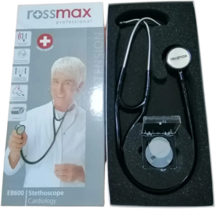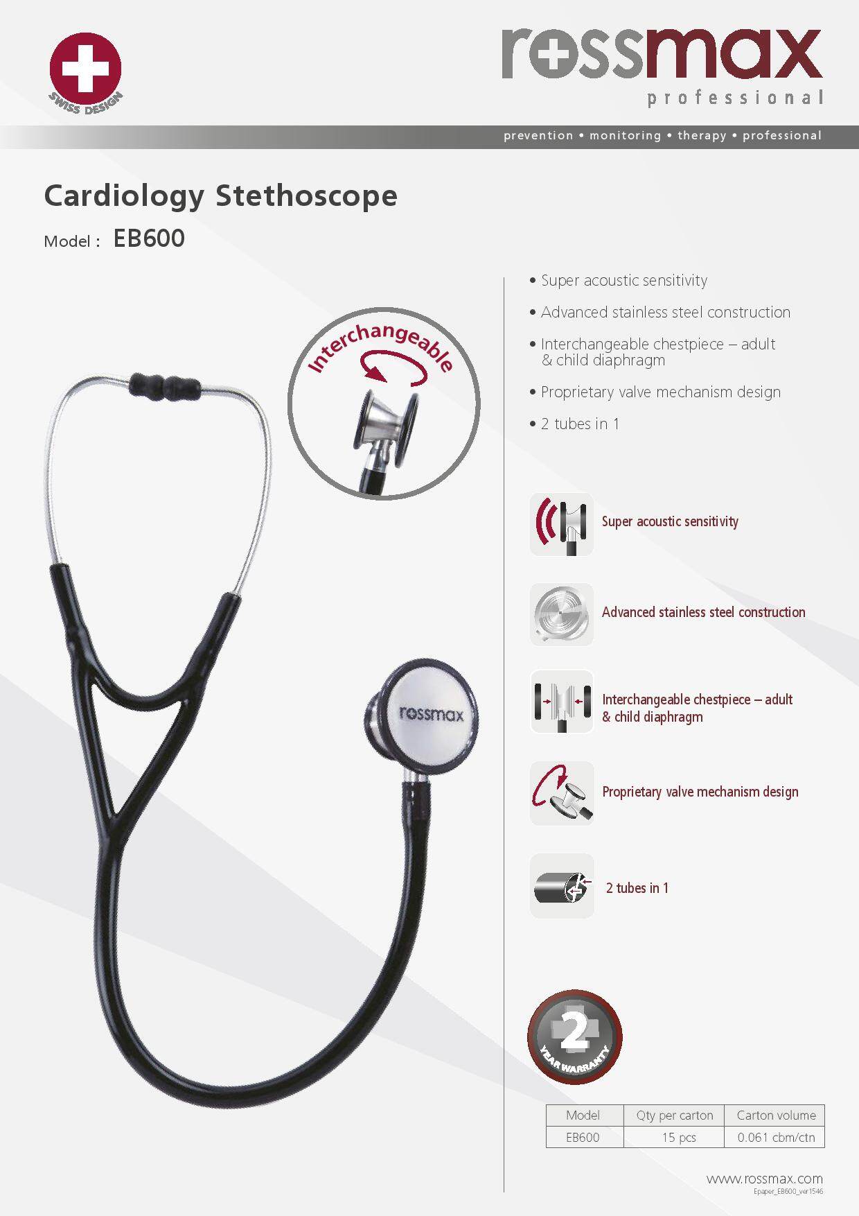 Model : EB600Cardiology Stethoscope. prevention • monitoring • therapy • professional15 pcs 0.061 cbm/ctn. Model Qty per carton Carton volumeEB600www.rossmax.comEpaper_EB600_ver1546• Super acoustic sensitivity• Advanced stainless steel construction• Interchangeable chest piece – adult & child diaphragm• Proprietary valve mechanism design• 2 tubes in 1Proprietary valve mechanism design. Advanced stainless steel construction. Super acoustic sensitivity. Interchangeable chest piece – adult& child diaphragm2 tubes in 1Interchangeable.